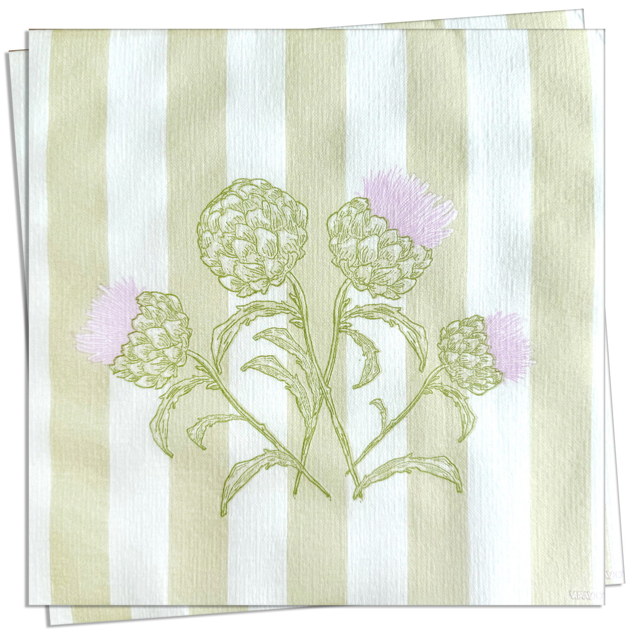 Artichaut Dinner Napkin - This design combines classic stripes with a delicate artichoke motif, bringing a fresh, botanical twist to your table. An ode to garden harvests that's both graphic and gourmet.